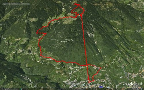Nach der Pause pedalierten wir weiter bergauf (ja Markus: locker aus der Hüfte :-)) über den Kuhleitenweg, vorbei an der Waidmannalm, Kirchstaiger Alm und der Meraner Hütte auf dem europäischen Fernwanderweg in Richtung Kreuzjoch. Nach ein paar Schiebepassagen und durch das reichliche Schmelzwasser ziemlich nasse und verschlammte Trails bogen wir wieder Richtung Westen ab und es ging auf Forststraßen und teilweise recht steilen und verblockten Single-Trails wieder hinunter nach Hafling.