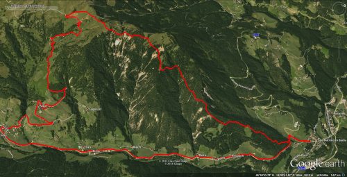 Aber das sollte es mit Trails für heute noch nicht gewesen sein! Nach einem kurzen Stück auf der Paßstraße bogen wir in Kolfuschg (Colfosco) nocheinmal nach Links ab, um auf einer teilweise sausteilen Schotterstraße in das Edelweistal hinauf zu radeln. Vorbei an der Edelweishütte ging es nochmal auf fast 2.000 m hinauf. Aber die Plagerei lohnt sich! Auf einem Sahne-Trail (allerfeinste Ware) mit vielen gut fahrbaren Spitzkehren geht es dann wieder hinunter Richtung Corvara.