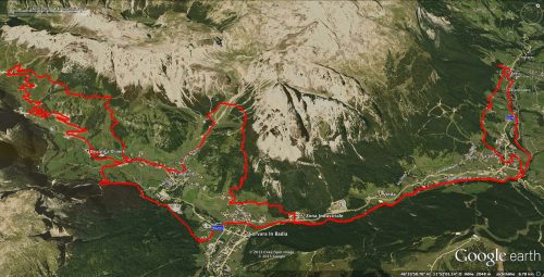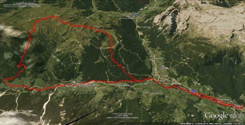 Am Sonntag stand nochmal eine Tour zur Pralongia zwischen Corvara und St. Kassian auf dem Programm. Wir fuhren zunächst auf bekannter Strecke an der Gader entlang nach Süden, zweigten diesmal aber bei La Villa Richtung Süd-Osten nach St. Kassian ab. Auf einem schönen Radweg ging es immer am Bach entlang, vorbei an St. Kassian bis zum Hotel Armentarola.