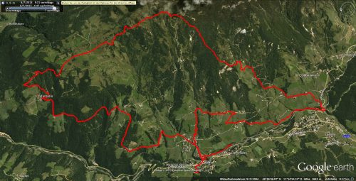 Kurz vor dem Gipfel führte uns dann der Weg rechts ab und wir fuhren auf einem teilweise schwierig zu befahrenden Trail mit vielen nassen Wurzelpassagen bei einsetzendem Regen wieder hinunter ins Tal. Dort angekommen begann es dann richtig zu regnen und wir rollten am Bach entlang wieder zurück ins Hotel nach Badia.