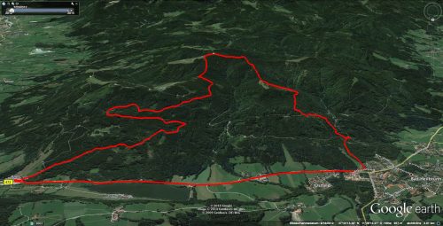Wir fuhren also am Vormittag Richtung Bad Tölz und parkten das Auto in Bad Heilbrunn wo die Tour am Nachmittag enden sollte. Dann ging es zunächst auf dem Radweg an der B 472 entlang vorbei am Stallauer Weiher zum großen Parkplatz an der Blombergbahn. Von dort führt eine stets gut fahrbare Forststraße hinauf Richtung Blomberg. Kurz vor dem Blomberggipfel zweigt ein Wanderweg rechts ab Richtung Zwiesel (1.348 m), dem relativ unbekannten Hauptgipfel der Tölzer Vorberge.