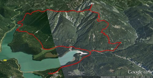 Nach der verdienten Pause ging es dann erstmal auf den Abstieg hinunter zu den Rädern, die wir nochmal ein Stück bergab tragen mussten, um dann immer wieder und immer öfter auf dem Rad stehend den Trail bergab zu befahren. Bis zum Schürpfeneck kamen noch einige Gegenanstiege und kurze Tragepassagen bergauf aber dann begann eine wunderbare, z.T. technische Trailabfahrt mit über 800 Tiefenmetern den Hühnerberg hinunter ins Walchental bis zum Ostende des Sylvestein-Stausees.