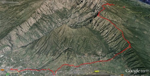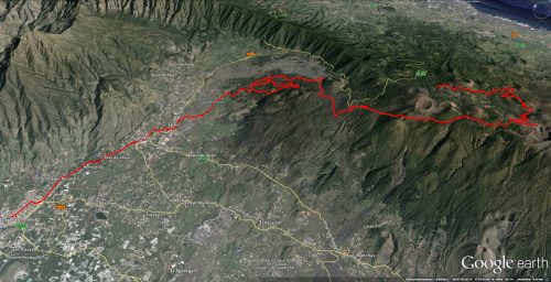Diese fuhren uns am ersten Tag Richtung Süd-Westen zum Refugio El Pilar auf eine Höhe von 1.580 m. Von hier aus fuhren, schoben bz. trugen wir unsere Bikes zunächst Richtung Süden, dann Richtung Westen hinauf auf knapp 1.900 m Höhe bis unterhalb des Pico Nambroque.