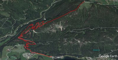 Auch in diesem Jahr wählten wir wieder die SW-seitige Auffahrt über die Abfahrtsroute, weil nordseitig mit Sicherheit noch viel zu viel Schnee in der Auffahrt lag. Wir pedalierten also los, anfangs war es noch etwas kühl aber das änderte sich schnell. Das Wetter war herrlich und die Auffahrt trocken. Auf ca. 1.000 m Höhe mussten wir, wie auch schon im letzten Jahr, auf der Forststraße wieder ein kurzes Schneefeld passieren – aber schon bald danach waren wir wieder am „Pausenbankerl“ wo der Abfahrtstrail das erste Mal auf die Forststraße trifft. Ab hier kamen die Analog-Bikes auf die Rucksäcke und die beiden E-Biker nahmen ihre Schiebeunterstützung zur Hilfe. So trugen bzw. schoben wir unsere Räder bergauf und es dauerte nicht allzu lange bis in den Schattenlagen die ersten Schneefelder auftauchten.