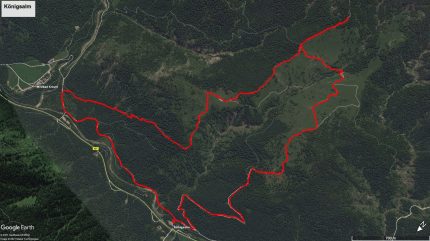 Wolfgang eilte hinter Manfred her, um ihm Bescheid zu geben und auch ich versuchte noch ein Stück weit zu folgen. Als Wolfi nicht mehr zu sehen war, drehte ich um und fuhr wieder hinunter zum Rest der Truppe, Manfred und Wolfi kamen ein paar Minuten später ebenfalls zurück. Gemeinsam ging es dann wieder hinunter zum Graseck und von dort auf dem Weg Nr. 615 an der Geißalm vorbei wieder hinunter Richtung Wildbad Kreuth.