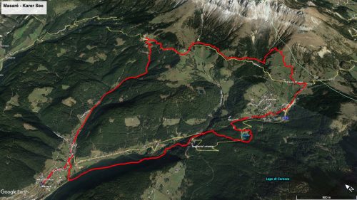 Ab der Hütte ging es dann auf schönen Trails wieder hinunter zur Nigerstraße bis zum Hotel Castel Latemar. Dort bogen wir rechts ab und fuhren auf kleinen Nebenstraßen und Wanderwegen zum Karer See. Dieser wurde kurz umrundet und dann fuhren wir auf Trails und Forststraßen immer am Welschnofer Bach entlang zurück nach Welschnofen ins Hotel, wo wir gegen 16:30 wieder ankamen.
