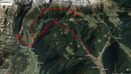 Danach folgten wir heute aber dem Weg nördlich des Baches über Weisslahn bergauf zum Wuhnleger Weiher. Über die Sauböden folgten wir einem wunderbaren Trail Richtung Westen. Kurz vor Völseck bogen wir scharf links ab und fuhren wiederum auf tollen Trails hinunter nach Tiers. Ich suchte auf der Karte eine Möglichkeite auf direktem Weg wieder hinüber nach Welschnofen zu fahren, ohne wieder bis zum Nigerpass hinauf zu müssen. Ich fand einen Möglichkeit, ließ mir das noch von einem Einheimischen bestätigen und schließlich fuhren wir auf einer Forststraße direkt von Tiers Richtung Süden bergauf. Zunächst human, zum Ende hin so steil, dass es auch mit dem E-Bike nicht ganz einfach war im Sattel zu bleiben fuhren wir bergauf, um dann schließlich auf Forststraßen (wegen des heranziehenden Regens suchten wir uns keine alternativen Trails mehr) wieder nach Welschnofen hinunter zu fahren.