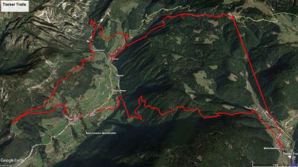 Weiter ging es also auf Forststraße und dann wieder auf Trails hinunter Richtung St. Zyprian. Von der Bushaltestelle Runggung (1.235 m) folgten wir noch einmal einer Forststraße ca. 200 Hm bergauf Richtung Norden. Dort nahmen wir den Abzweig in einen wunderbaren Trail, der uns hinunter zur Tschaminschwaige führte. Dort gab es noch einmal eine Erfrischungspause, bevor wir weiter nach St. Zyprian und von dort auf Forststraßen durch den Wald wieder hinauf zum Nigerpass fuhren.